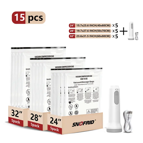 Cordless Travel Vacuum Storage Compression Bag Set – 15-Pack in 3 Sizes – USB Rechargeable Handheld Pump with Built-In Battery – Waterproof & Reusable Space Saver for Clothes & Packing, Perfect for Carry-On Suitcases